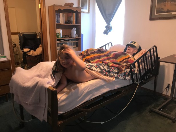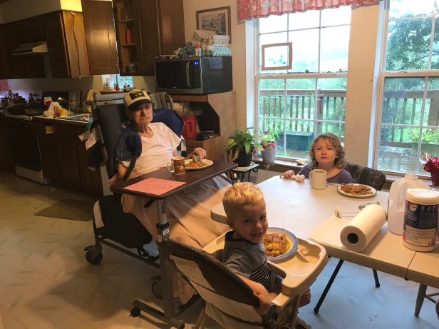 Another change that happened over the summer was that we started getting dad up out of bed and into a wheelchair using a lift. We’d take him outside for a bit during the bearable parts of the day and now since it’s too chilly, we set him up during lunch time so he can eat his main meal sitting upright. It’s amazing that he’s still kicking. There have been many times over the past two years that I thought, This is it, and was probably hoping it was, but nope, he manages to recover. I know a lot of it has to do with the constant attention from his kids, grandkids and even great grandkids. And even though I complain about it, I really am happy for this time with my siblings and nieces and nephews. And I’m extra happy that Iris gets to experience life on the farm. We have a lot of fun.