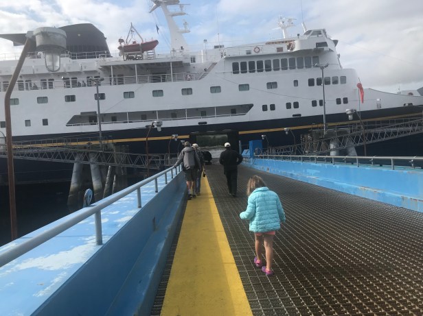 When we got word of the ferry’s demise, I was more upset at not being able to make that cruise, in addition to having to drive all that way. I love riding on the Alaska Ferries! So there was relief at not having to drive and delight at being able to make the ferry trip when I heard they restored service. It’s so much fun! But I forgot to bring stuff to do so we did a lot of walking around and playing with other children. There were at least five jigsaw puzzles going that passengers take turns on and there were a few books that people had left, both children’s and adult. Mostly a person just relaxes on the ferry. This carrier, the M/V Columbia, is about four times as big as the M/V Tustumena that travels the Southwest waters that would take us to Chignik. Like the Tustumena, people can pitch their tents on the deck to get the full experience. I did that with Iris the last time going to Chignik but this time we stayed in a stateroom. It has a double story car deck and two stories with rooms. It boasts a big theatre room as well as a children’s play area. There were quite a few children on board who were continually berated over the loudspeaker for running aboard ship. Iris was not one of them. Most of them were military families on the move. There was one lady who had four children under eight all by herself. I think those were the ones getting in trouble. They had been stationed in Hawaii and were now being moved to Fairbanks. I’m guessing her husband went ahead while she brought the kids and vehicle up. She has my kudos.