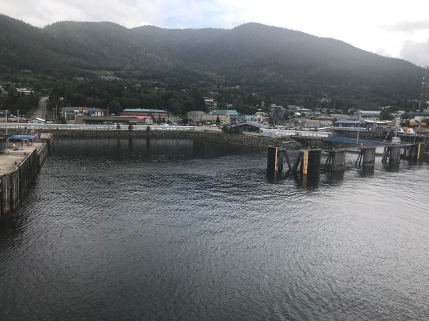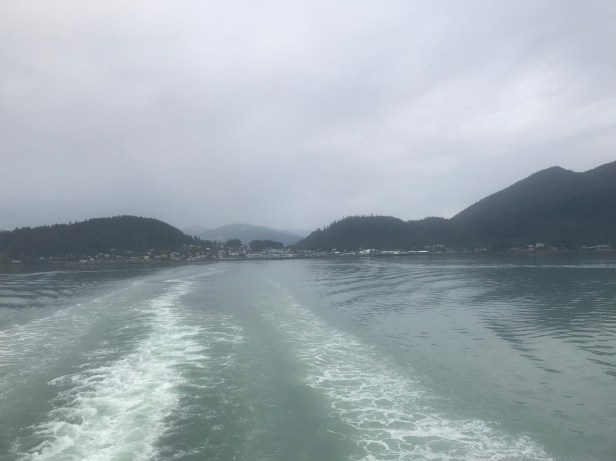 We got antsy waiting to board the ferry so we got out to stretch our legs. Happened to look down at the tire and see two bubbles in the sidewall of the driver’s side front tire. Oh no! Neither of the two men I asked could tell me how serious it was, not even the guy next to me with the cherry red ’68 Mustang that he kept covered from the gulls’ droppings. I wasn’t worried, I knew there were places in Haines to have it replaced. In the meantime, the other classic car in the back of the line wasn’t moving forward. What’s this dude’s problem? The ferry guy went to check it out and before long some of the bikers on the other side of me went to check it out too. The car wouldn’t start. Several of them tried, to no avail. A decision was made, push the car on board and then have a tow truck come pick it up at its destination. Cherry red Mustang man, the bikers, and several ferry personnel pushed the 70-ish era Nova up the gentle incline and onto the boat. Cheers all around.